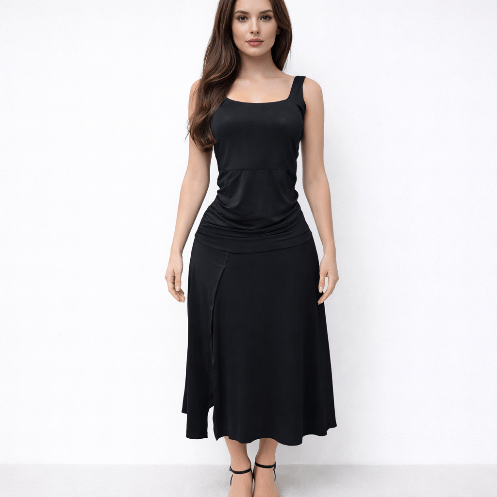 vestido con corte en la cintura, la parte superior es entallada,escote sutil cuadrado, con una falda de caída fluida y apertura lateral derecha.